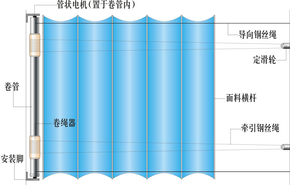 面料部分的上半部分是一根两端固定并绷紧的钢丝(天棚帘跨度过大时改用滑动门轨)。下半部分为面料。面料从顶端开始安装引布轴,间距等分。引布轴上安装滚动滑轮,滑轮在固定钢丝上滚动。第一根引布轴与传动钢丝联接,在电机带动下面料沿着固定钢丝展开、收拢。