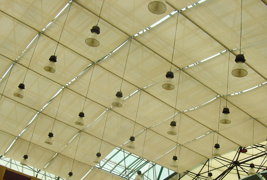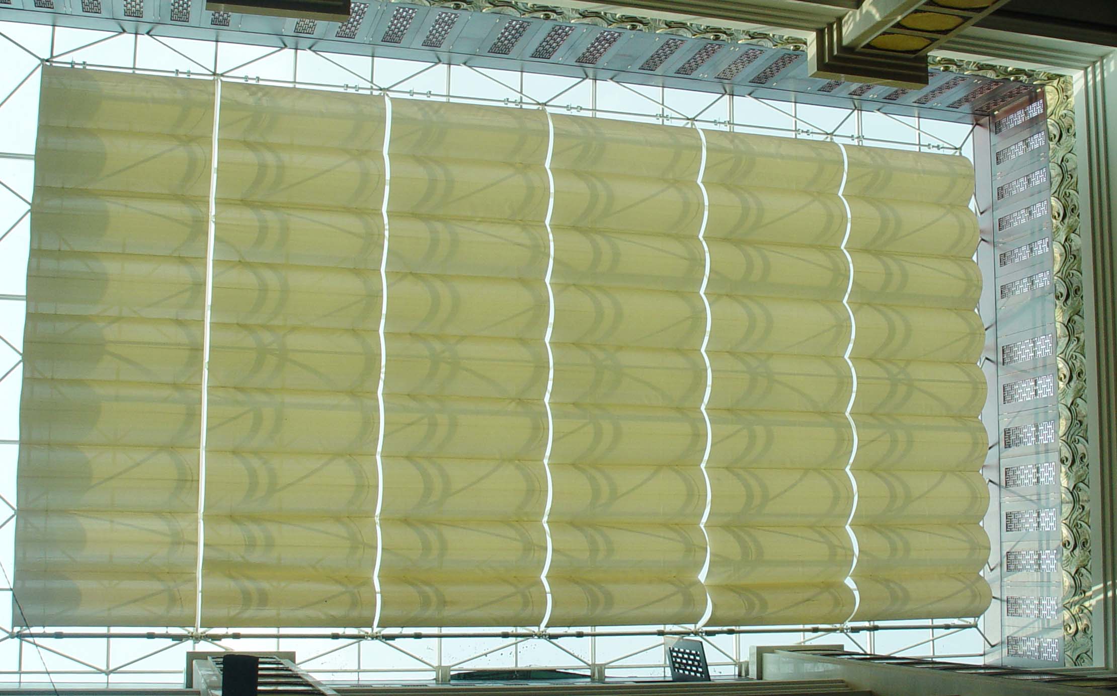 FCS折叠式天棚帘方案造价合理,美观大方、稳定性非常好,安装后,该折叠系统呈波浪状,给建筑增添了活跃的气氛。